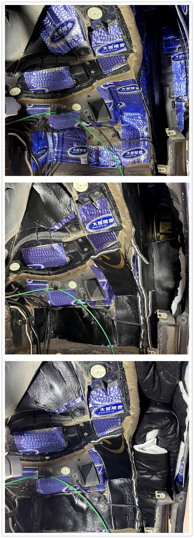 根據路測得到了噪音的相關數據,改裝師便使用性價比較高、隔音效果出色的大能品牌套餐對噪音傳入的主要部位:四輪、四門進行專業隔音施工,以降低傳入車內的路噪和風噪。并且在做隔音之前對車身進行了全面的保護,預防在施工過程中對車身造成不必要的傷害。