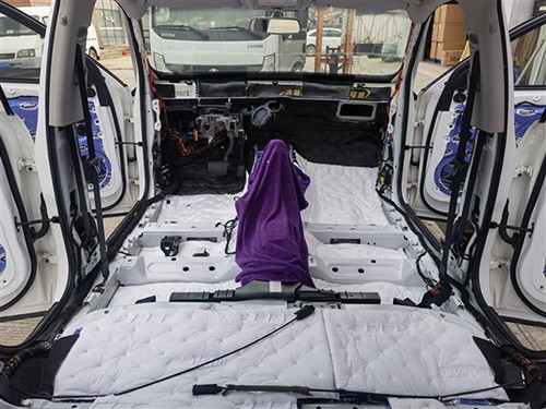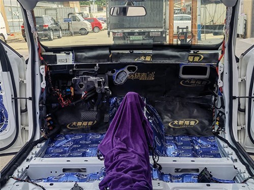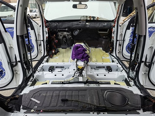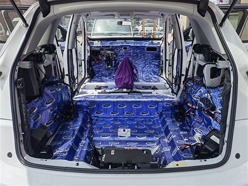 汽車在路面上行駛時也有明顯的低頻共振噪音影響著車主的駕駛感受,此噪音是由防火墻、車底盤,后尾箱傳遞到駕駛艙內的。因此,海林技師選擇大能藍金剛、溫莎吸音棉、低頻王分別對車底盤,后尾箱、防火墻部位進行雙層隔音降噪處理,有效阻隔車內低頻共振噪音。