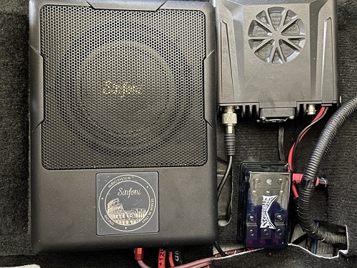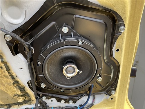 本次的音響升級,前聲場使用詩芬尼S62兩分頻套裝,詩芬尼有著出色的人聲演繹,播放的音樂十分耐聽,讓人不容易產生聽覺疲勞。高音、中低音無損安裝,中低音安裝時還加裝了美音圈,能填充原車內飾板和喇叭間的間隙,防止音效擴散,讓聲音集中向車內傳出,吸收車門噪音,提升喇叭音質的功效。
