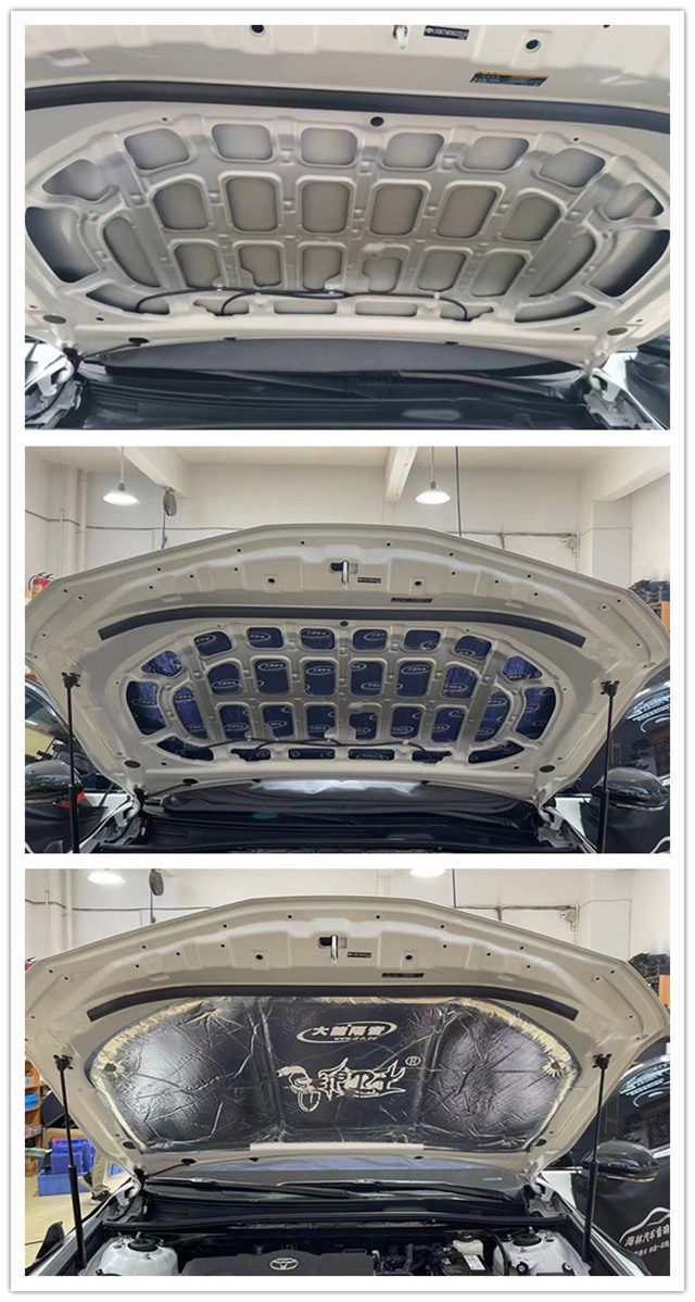 我們的汽車引擎蓋是離發(fā)動機(jī)的距離最近的,發(fā)動機(jī)工作時就會不斷引起周邊金屬的振動,然后將噪音進(jìn)行傳遞,熱量的產(chǎn)生也會對引擎蓋進(jìn)行烘烤,導(dǎo)致漆面老舊,影響漆面的美觀。所以改裝師使用大能藍(lán)金剛做第一層止振的基礎(chǔ),再貼上銀衛(wèi)士作為第二層,有了銀衛(wèi)士的加入,讓隔音隔熱產(chǎn)生立竿見影的效果。