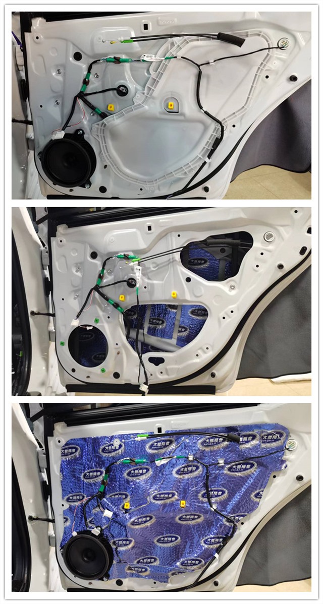 汽車行駛產(chǎn)生的胎噪主要通過輪弧等部位傳入到車廂內(nèi)部,因原車輪弧同其他部位一樣,并未做任何的隔音處理,這意味著胎噪可以輕而易舉的傳入到車廂內(nèi)部。針對胎噪的問題,一共使用了三種材料,分別是大能藍(lán)金剛、噪音終結(jié)者、超級溫莎可以非常有效的減少胎噪向車內(nèi)的傳遞。