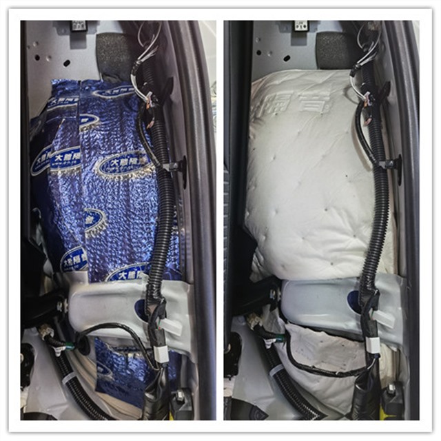 門板是風(fēng)噪的主要傳播途徑之一,但原車的門板鐵皮結(jié)構(gòu)單薄,內(nèi)部的空洞結(jié)構(gòu)較多,汽車在行駛時候產(chǎn)生的風(fēng)噪很容易通過門板傳入到車廂的內(nèi)部,因此使用大能藍(lán)金剛對門板做了隔音止震處理,有效降低風(fēng)噪的傳入,以及抑制鈑金共振。并且還使用超級溫莎對門板飾蓋進(jìn)行填充,使整體的隔音效果更佳。