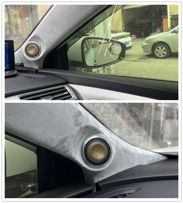 在隔音處理完成后,為了達到精準的音質,選用勁浪黃盆KX2兩分頻作為前聲場,并在A柱上安裝高音喇叭,中低音采用的是門板喇叭直裝方式,并且加入了墊圈和美音圈,讓喇叭更加耐用,演繹出更加令人耳目一新的優美音樂。對于后聲場部分,我們選擇了勁浪RSE-165兩分頻,可以很好地配合前聲場實現全車環繞立體音效。