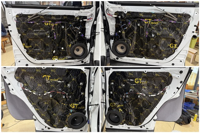 原車(chē)門(mén)板僅有一層薄弱的防水膜,無(wú)法抑制振動(dòng)和噪音。我們將其清除后,使用GT隔音材料進(jìn)行了標(biāo)準(zhǔn)的三層隔音處理,完成第二層隔音時(shí),我們還將勁浪喇叭在前后門(mén)板進(jìn)行了原位無(wú)損安裝,還加裝了美音圈,使聲音集中起來(lái)。