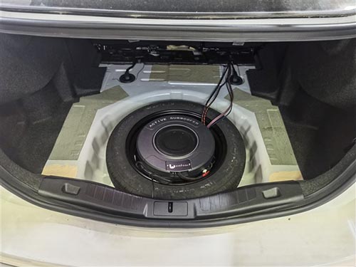 為了彌補原車低頻缺失的困擾,海林改裝師搭配了詩芬尼備胎低音炮。它的外形設計合理,將其安裝在備用輪胎的中間剛好合適;低頻下潛力度深,彈性十足,進行調音后,效果奇佳,完全能夠滿足車主對低頻部分的需求。