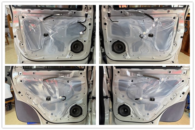 為了給喇叭創造一個更加安靜、干凈的聽音環境,改裝師使用大能超級盾對四門和尾箱區域進行了專業隔音處理。大幅削減車內共振和噪音干擾,提升整體車廂靜謐性。在與車主充分溝通后,前后聲場選用法國勁浪ES 165 KE兩分頻,中低音原位安裝在前后門板,搭配隔音處理,有效提升中頻飽滿度和低頻的下潛力度;高音分別安裝在前門三角位和后門板上。