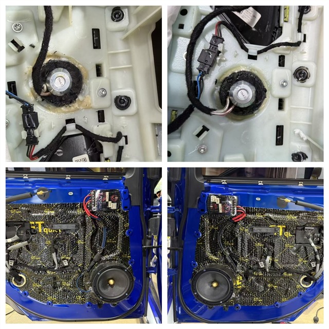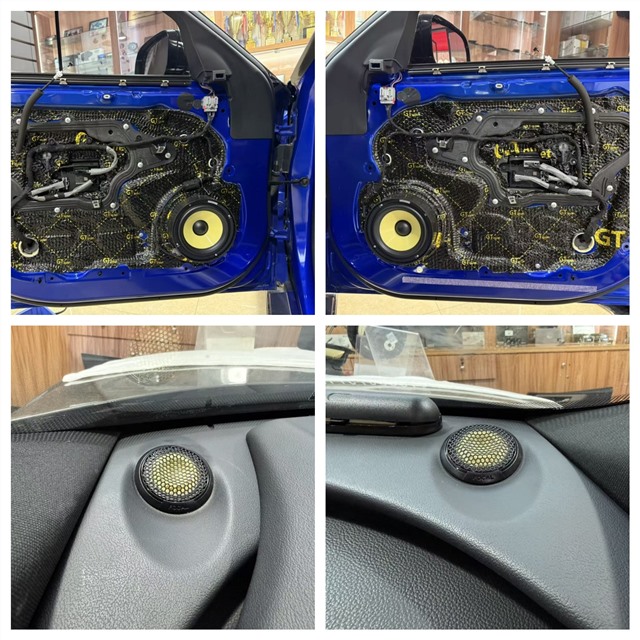 前聲場(chǎng)選用法國(guó)勁浪ES165K兩分頻,這套源自法國(guó)的音響利器搭載凱夫拉纖維振膜,兼具輕量化與剛性優(yōu)勢(shì),能精準(zhǔn)還原動(dòng)態(tài)細(xì)節(jié)。技師將高音單元原位嵌入儀表臺(tái)兩側(cè),與原車內(nèi)飾無縫融合;中低音則在門板完成GT雙層隔音后安裝——內(nèi)層止振墊抑制鈑金共振,外層密封形成密閉音腔,為喇叭搭建穩(wěn)定發(fā)聲環(huán)境。
