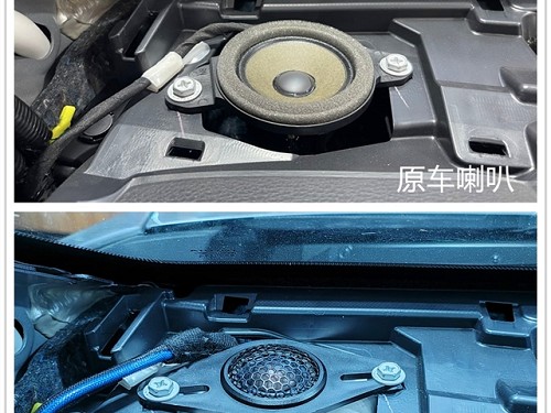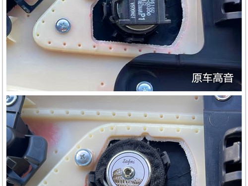 隔音后,我們選擇了一套詩芬尼S65兩分頻,以提升前聲場的音響效果。與原車喇叭相比,詩芬尼S65高音喇叭采用金屬球頂,聲音清脆悅耳。我們巧妙地將詩芬尼S65高音喇叭安裝在儀表臺兩側,原位無損安裝,使改裝后的效果毫無痕跡,令人難以察覺。