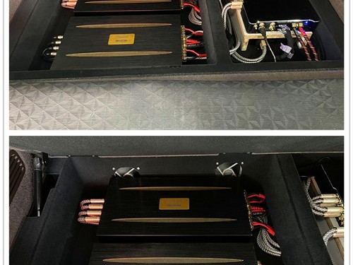 兩臺弗萊德FX-4功放及一臺歌航R316DSP處理器隱藏安裝在尾箱的凹槽位置