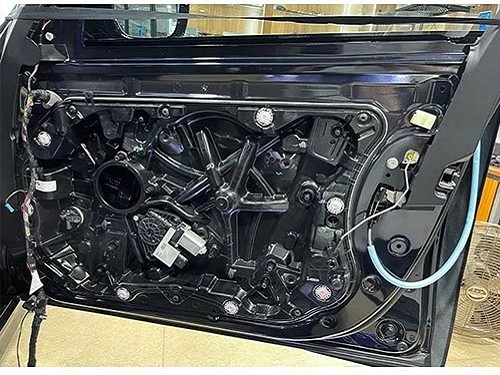 原車門板隔音不足,行駛中風(fēng)噪容易傳入車廂,影響音響表現(xiàn)。因此,改裝師為寶馬四門進(jìn)行了大能藍(lán)金剛雙層隔音處理。這樣不僅有效減少噪聲干擾,還能增強(qiáng)車門鈑金厚度,使喇叭在播放時(shí)的音質(zhì)更加穩(wěn)定。