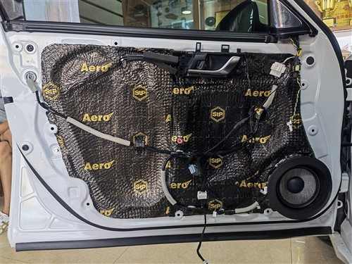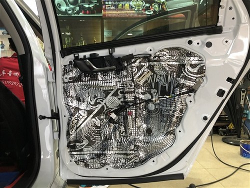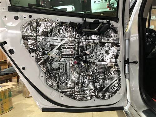 四門隔音對(duì)于聲場喇叭的音質(zhì)是有提升的,隔音后將門板形成一個(gè)密閉的箱體,提升音質(zhì),再者還可降低風(fēng)噪。針對(duì)噪音特點(diǎn),改裝師前門使用俄羅斯StP航空炸彈,后門使用俄羅斯StP小炸彈,將隔音材料緊密貼合鈑金,使得隔音效果達(dá)到最佳。