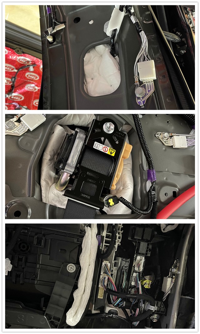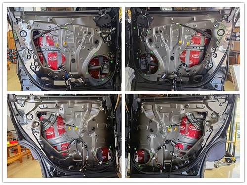 原車門板鐵皮結構拆開飾蓋可以看到,門板的隔音措施較少,而且又有較多的空洞結構,風噪和門板震動的噪音很容易就傳入車內。因此改裝師對門板進行三層隔音處理。汽車門板的隔音處理一方面能夠降低噪聲,而另一方面又能增強鈑金剛性。改裝師先用大能紅派對門板進行雙層隔音處理,主要起的是止振密封的作用,再使用超級溫莎對門板飾蓋進行第三層隔音處理,將車廂打造成一個結實的音箱。