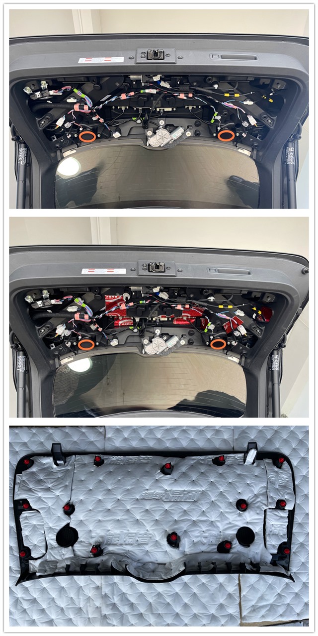 后備箱蓋只是一層單薄的鐵皮結構,汽車在行駛的時候這些部位也很容易產生振動。所以我們的改裝師使用大能隔音材料對后備箱蓋做了隔音處理,極大地減少了行車時產生的共振噪聲。