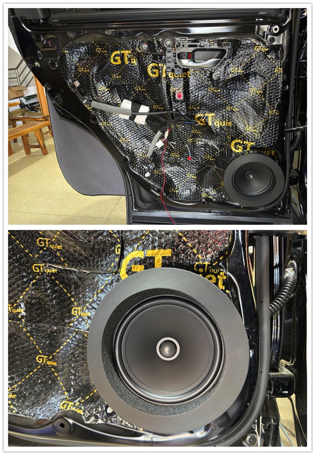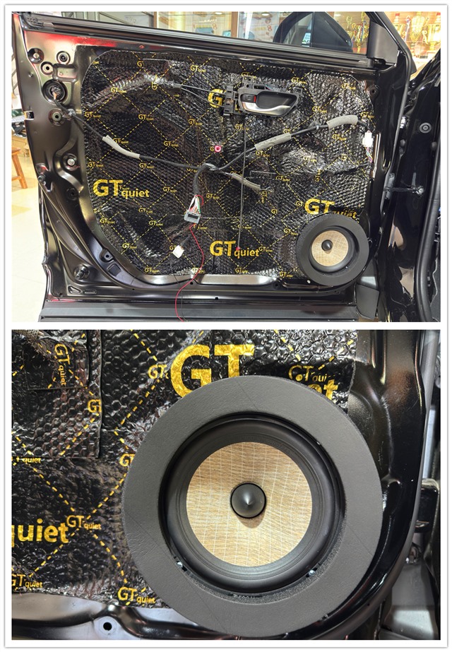 改裝的第一步,改裝師使用GT隔音材料對四門進行雙層隔音處理。不僅能降低車外噪音對車內的干擾,還能減少車門共振,提升喇叭的發聲效果,為后續的音響升級打下堅實基礎。前聲場選擇了勁浪PS 165 FXE兩分頻。這套喇叭采用亞麻纖維材質音盆,能夠呈現更加溫暖、飽滿的聲音效果。高音無損安裝在A柱,中低音則無損安裝在前門板,并加裝美音圈,進一步優化發聲效果。