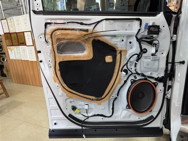阿爾法原車門板內部僅有一層簡單的塑料防水膜,無法起到隔音作用。我們將其徹底清除,首先在內層鈑金緊貼一層 大能紅派,有效抑制車門共振。隨后,在外層再密封一層 紅派,形成一個扎實的箱體結構。這不僅大幅降低了風噪和外界環境音的傳入,更能讓車門變得更加厚實,關門聲更加沉穩。最后,在門板飾蓋上粘貼 超級溫莎,進一步吸收殘余噪音,并為音響系統提供一個更佳的工作環境。