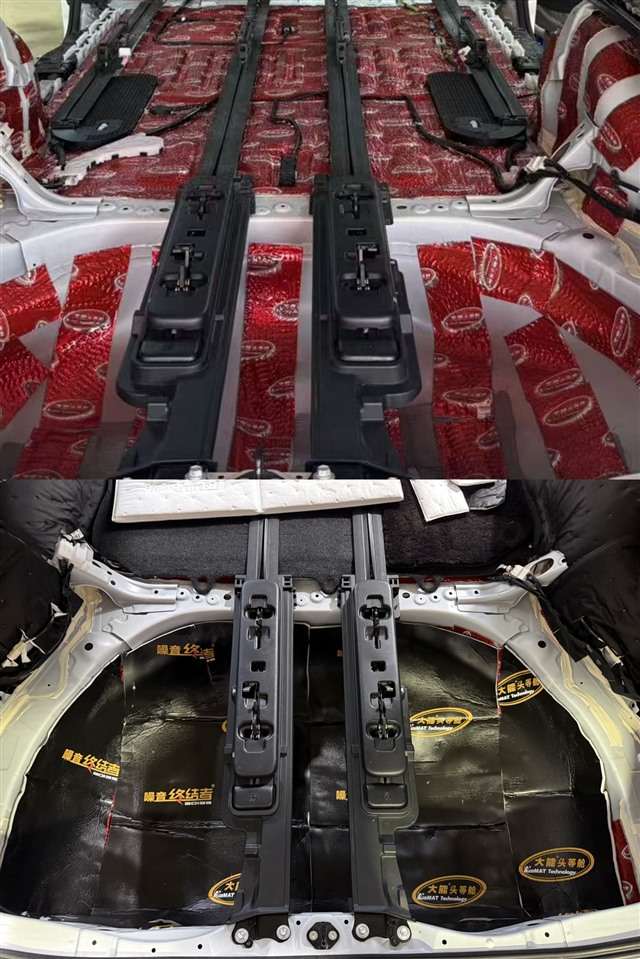 底盤是路噪和低頻共振的主要來源。我們將座椅、地毯等全部拆開,對裸露的鈑金進行徹底清潔。首先滿鋪 大能紅派 止振板,牢牢抑制住底盤的振動。隨后,在止振層之上再覆蓋一層 噪音終結者 吸音棉,將傳導至車內的中高頻路噪和輪胎噪音層層吸收、過濾。特別是駕駛員和乘客的 前腳踏 區域,這里是前輪噪傳入的主要路徑,我們同樣采用了 紅派+噪音終結者 的雙層處理,從源頭上阻隔煩人的路噪。