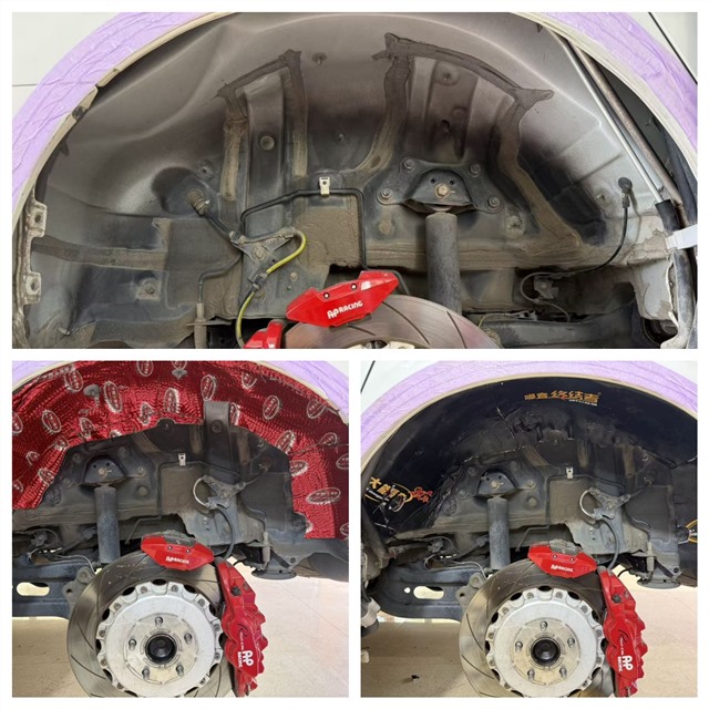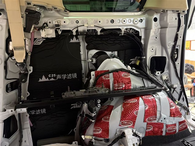 輪胎與地面摩擦產生的噪音,主要通過輪弧和翼子板傳入車廂。我們針對 四輪翼子板 這個重點部位,進行了三重隔音處理:先在鈑金上粘貼 大能紅派 止振,再填充 噪音終結者 吸收雜音,最后在輪弧襯板內側加貼 超級溫莎,形成一道立體化的防線,讓最為惱人的胎噪“銷聲匿跡”。
