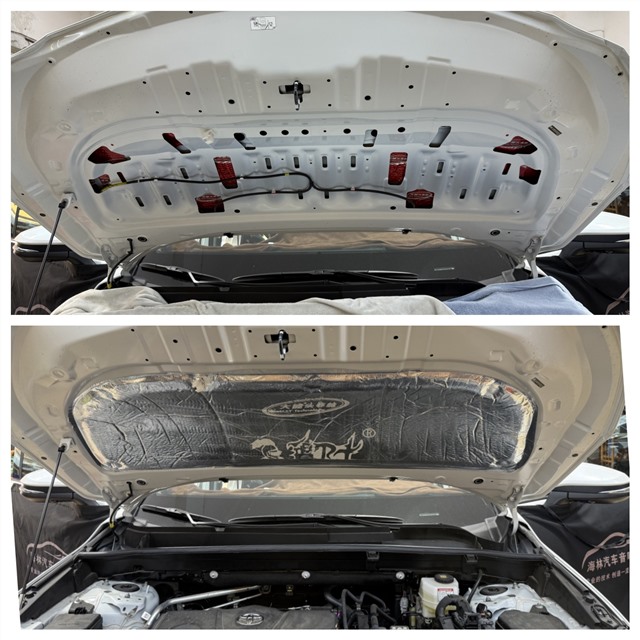 同時(shí),輪轂部位同步做雙層隔音處理,尾門的空洞部位也針對(duì)性進(jìn)行減振施工,后備箱蓋則額外加裝 C25 聲學(xué)濾鏡,進(jìn)一步優(yōu)化隔音效果。引擎蓋部位的處理同樣細(xì)致,施工團(tuán)隊(duì)采用大能銀衛(wèi)士進(jìn)行止振處理,同時(shí)兼顧隔熱功能,不僅能降低發(fā)動(dòng)機(jī)運(yùn)轉(zhuǎn)時(shí)的噪音傳遞,還能保護(hù)引擎蓋漆面免受高溫?fù)p傷。