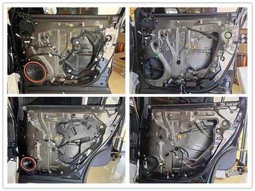 原車門板鐵皮結構拆開后可以看到,門板的隔音措施較少,且有較多的空洞結構,風噪和門板震動的噪音很容易傳入車內。因此,改裝師對門板進行了三層隔音處理。這不僅能降低噪聲,還能增強鈑金剛性。改裝師先用大能紅派對門板進行雙層隔音處理,主要起止振密封作用,再使用超級溫莎對門板飾蓋進行第三層隔音處理。